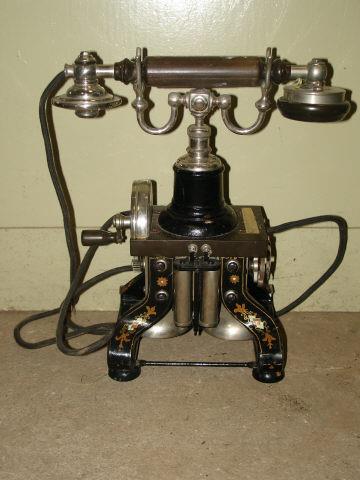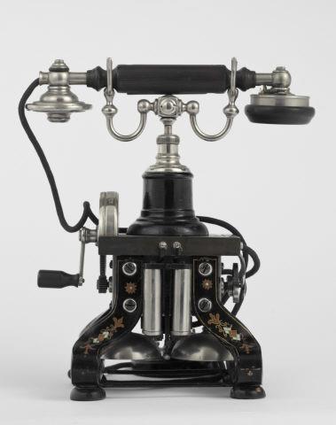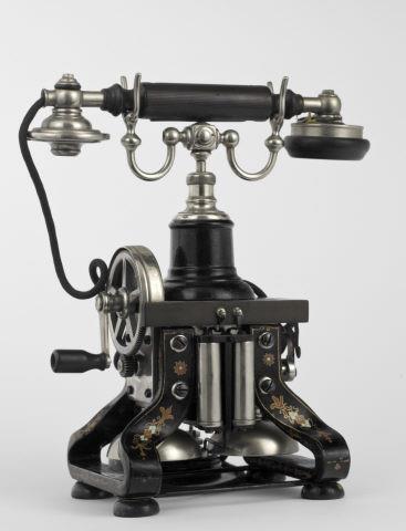 Telefone de mesa manual, modelo Ericsson AC 110, de funcionamento a magneto, composto por auscultador, pega isoladora e microfone. Utilizado para comunicações de serviço entre estações e outros pontos da via (por exemplo, passagens de nível, postos de sinalização).