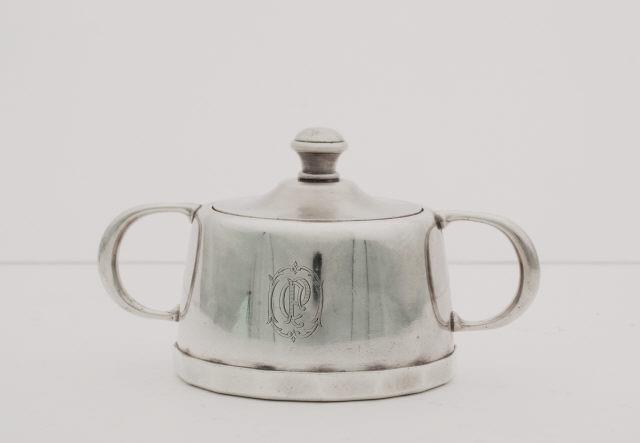 Açucareiro pertecente ao serviço de chá e café, constituído por chaleira, leiteira, cafeteira, bule, açucareiro e bandeja. Em liga metálica, cada peça apresenta o monograma da CP, representativo da Companhia dos Caminhos de Ferro Portugueses.