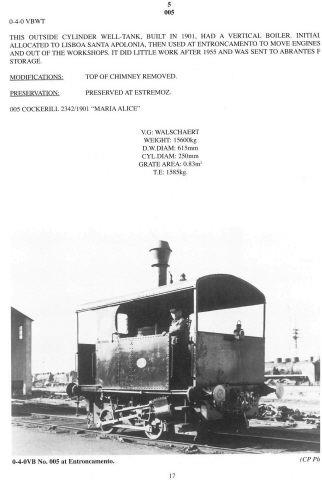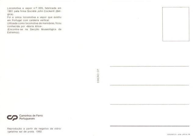 Locomotiva a vapor de construção belga, no ano de 1901, pela Société John Cockerill, na localidade de Seraing, com o n.º de fabrico 2342. À semelhança das locomotivas da série CP 001 a CP 004, a locomotiva CP 005 era uma máquina utilizada no serviço de manobras, ficando conhecida por "Maria Alice". Modelo típico do fabricante Cockerill para manobras e utilizações industriais, tendo a característica especial de ter uma caldeira vertical do tipo Field, permitindo uma vaporização rápida. Prestou serviço nos depósitos de máquinas de Lisboa-P (Santa Apolónia) e do Entroncamento. Foi utilizada até 1955, ano em que foi retirada do serviço.