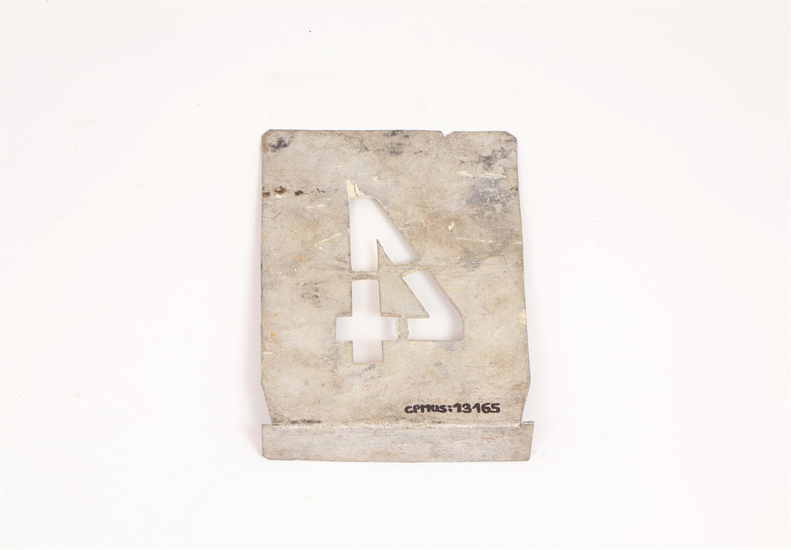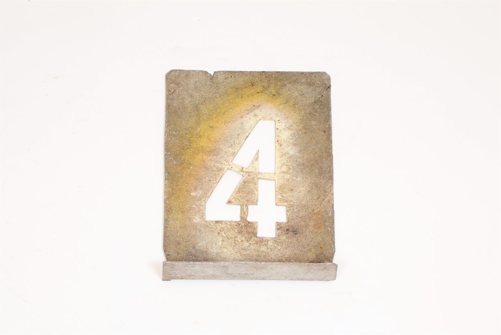Molde ou régua em chapa metálica, utensílio dotado de recorte em forma conveniente para ser reproduzido e executar determinado desenho, número ou letra de forma repetida e regular. Também designado de "escantilhão". Este molde permite executar o número "4". Utilizado em contexto de oficina para inscrição de numeração/lettering sobre as máquinas, a título de exemplo, a data das revisões gerais realizadas.